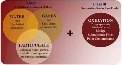 Class II Liquids: contain excessive particulate, moisture, and dissolved gases. A basic high vacuum purifier will remove all three of these and return the oil to within specification.